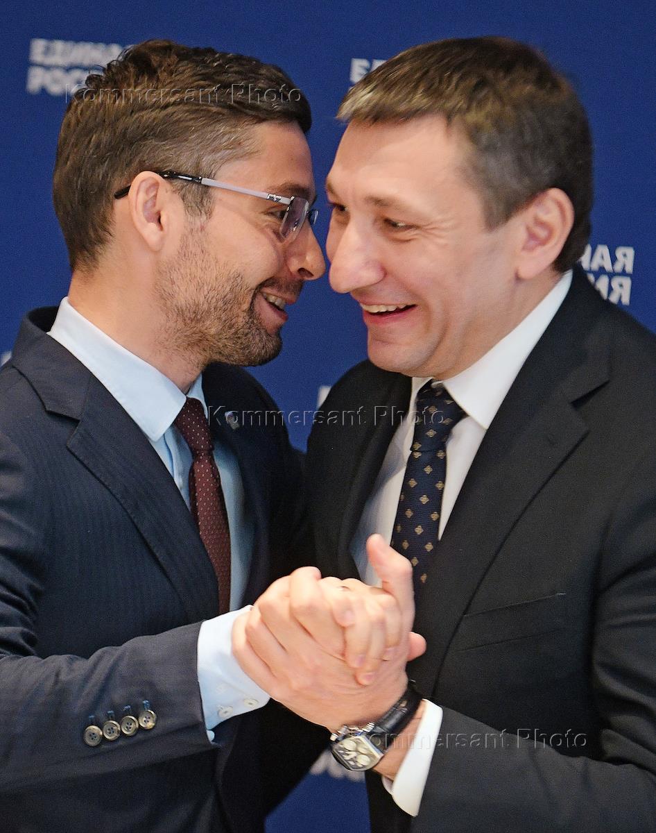 Заседание "круглого стола "Развитие отрасли индивидуального жилищного строительства" в рамках совместного проекта партии "Единая Россия" и компании "ДОМ.РФ". Член комитета Государственной думы России по энергетике Александр Якубовский (слева) и заместитель генерального директора компании "ДОМ.РФ" Денис Филиппов (справа) перед началом заседания.