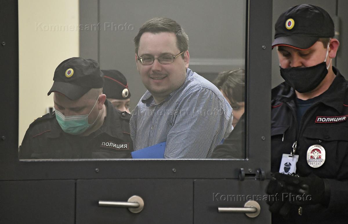 Рассмотрение апелляции на решение Калининградского областного суда, приговорившего супругов Антонину Зимину и Константина Антонца к 13 и 12,5 годам лишения свободы соответственно за государственную измену в пользу спецслужб Латвии в Первом апеляционном суде. Бывший юрист Константин Антонец (в центре) перед началом заседания.