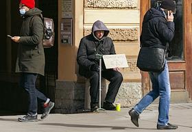 Жанровая фотография. Нищий просит милостыню. Надпись "Помогите на еду".