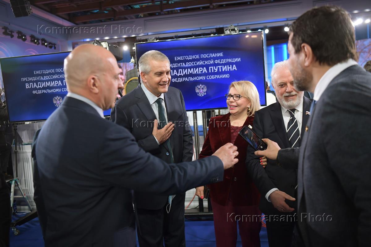 Ежегодное Послание президента России Владимира Путина Федеральному Собранию в Центральном выставочном зале "Манеж". Глава Республики Крым Сергей Аксенов (второй слева), член комитета Государственной думы (ГД) России по международным делам Елена Панина (в центре) и заместитель председателя комитета ГД по финансовому рынку Игорь Дивинский (второй справа) и первый заместитель председателя комитета Государственной думы России по труду, социальной политике и делам ветеранов Николай Коломейцев (справа) перед началом ежегодного послания.