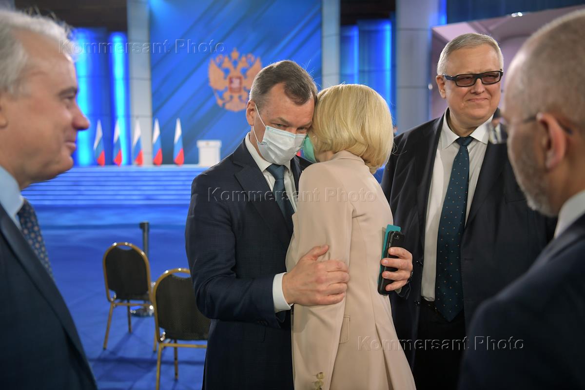 Ежегодное Послание президента России Владимира Путина Федеральному Собранию в Центральном выставочном зале "Манеж". Губернатор Ярославской области Дмитрий Миронов (слева) и губернатор Краснодарского края Вениамин Кондратьев (справа) перед началом ежегодного послания.