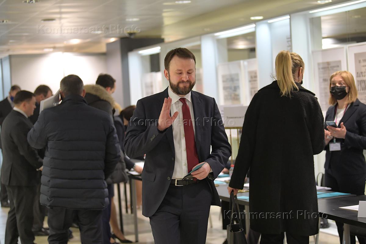 Ежегодное послание президента России Владимира Путина Федеральному Собранию в Центральном выставочном зале "Манеж". Член комитета Государственной думы России по экономической политике, промышленности, инновационному развитию и предпринимательству Денис Москвин (в центре) перед началом заседания.