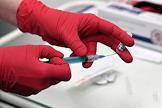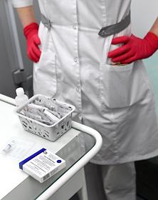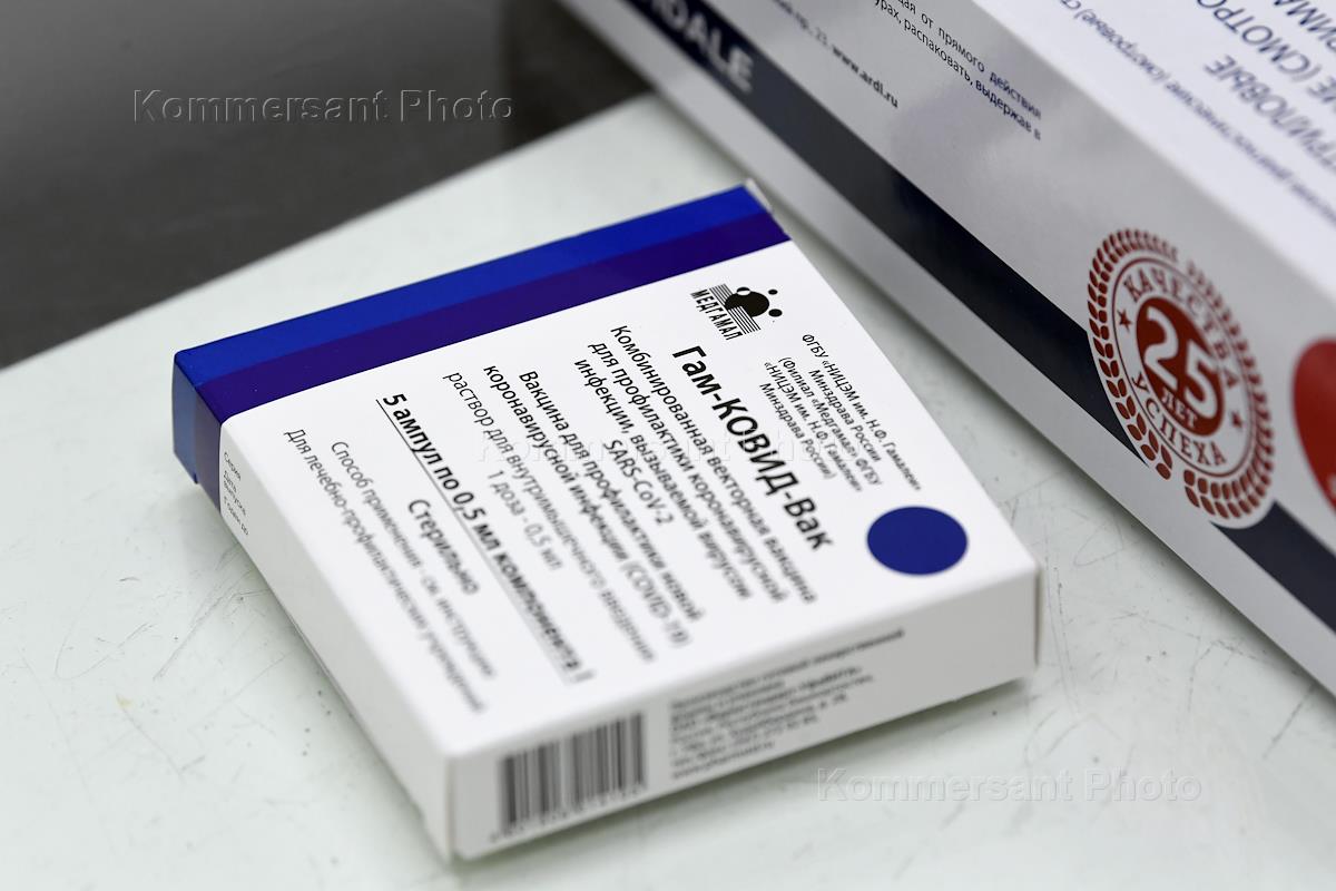 Вакцинация от коронавирусной инфекции COVID-19. Жанровая фотография. Прививочный пункт в Центральном универсальном магазине (ЦУМ). Упаковка вакцины Гам-КОВИД-Вак ("Спутник V").