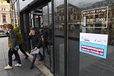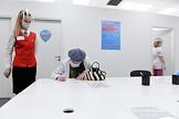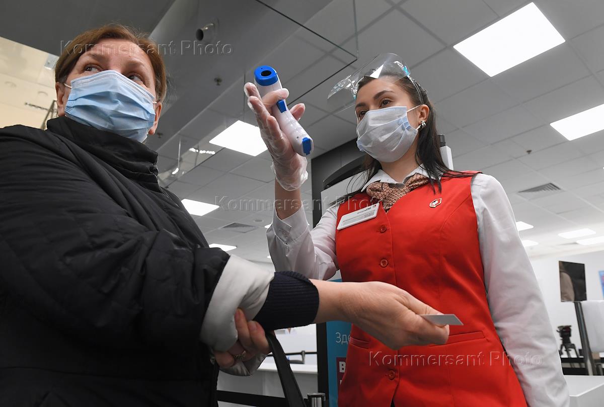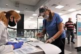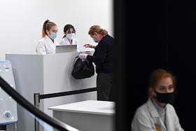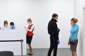 Вакцинация от коронавирусной инфекции COVID-19. Жанровая фотография. Прививочный пункт в Центральном универсальном магазине (ЦУМ). Регистрация пациентов перед вакцинацией.