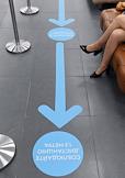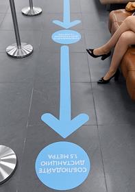 Вакцинация от коронавирусной инфекции COVID-19. Жанровая фотография. Прививочный пункт в Центральном универсальном магазине (ЦУМ). Разметка социальной безопасной дистанции на полу.