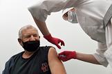 Вакцинация от коронавирусной инфекции COVID-19. Жанровая фотография. Прививочный пункт в Центральном универсальном магазине (ЦУМ). Медицинский работник и пациент во время вакцинации.