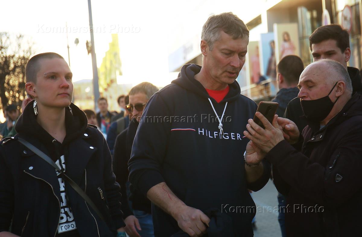 Несогласованная акция в поддержку оппозиционера Алексея Навального в центре города. Бывший глава Екатеринбурга Евгений Ройзман (справа) во время акции.
