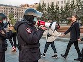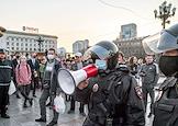 Участники несогласованной акции в поддержку оппозиционера Алексея Навального. Сотрудник полиции с мегафоном предлагает участникам покунуть место сроведение акции.