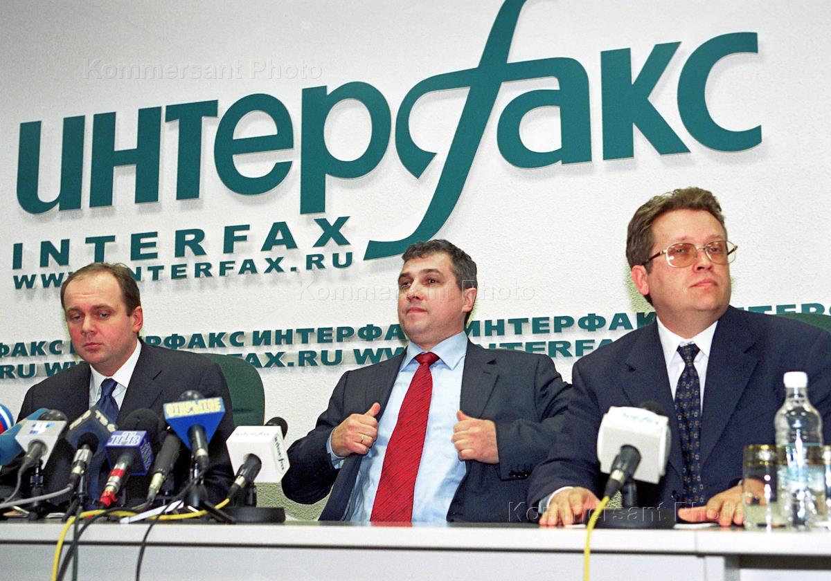 После собрания акционеров компании НТВ было назначено новое руководство : председателем совета директоров телекомпании НТВ Альфред Кох (слева), генеральным директором телеканала Борис Йордан (в центре) и главным редактором телеканала НТВ Владимир Кулистиков (справа). В агентстве "Интерфакс" состоялась пресс-конференция нового руководства.