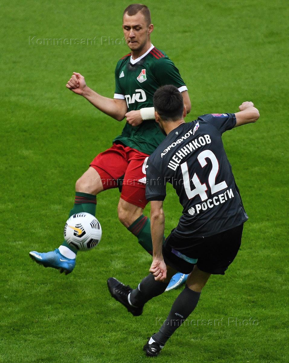 БЕТСИТИ Кубок России по футболу 2020-2021 гг. 1/2 финала. Матч между командами "Локомотив" (Москва) - ЦСКА (Москва) на стадионе "РЖД Арена". Игрок команды "Локомотив" Дмитрий Баринов (слева) и игрок команды ЦСКА Георгий Щенников (справа) во время матча.