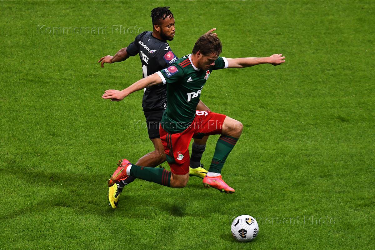 БЕТСИТИ Кубок России по футболу 2020-2021 гг. 1/2 финала. Матч между командами "Локомотив" (Москва) - ЦСКА (Москва) на стадионе "РЖД Арена". Игрок команды "Локомотив" Франсуа Камано (слева) во время матча.