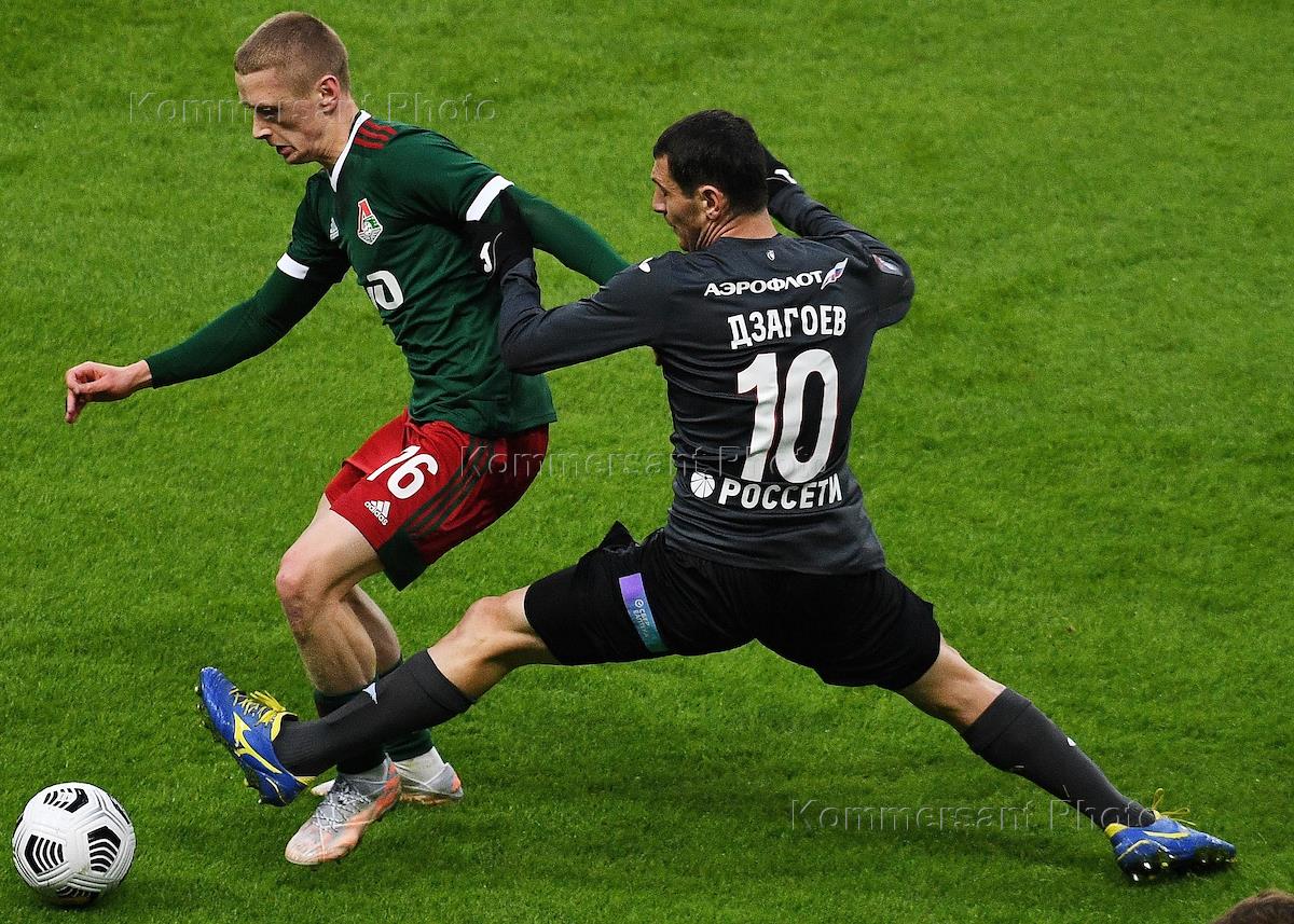 БЕТСИТИ Кубок России по футболу 2020-2021 гг. 1/2 финала. Матч между командами "Локомотив" (Москва) - ЦСКА (Москва) на стадионе "РЖД Арена". Игрок команды ЦСКА Алан Дзагоев (справа) и игрок команды "Локомотив" Максим Мухин (слева) во время матча.