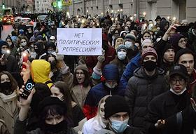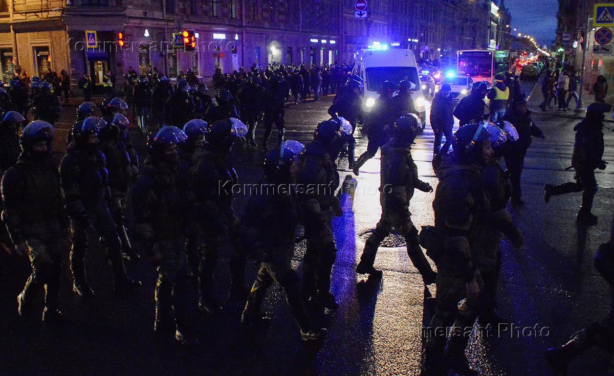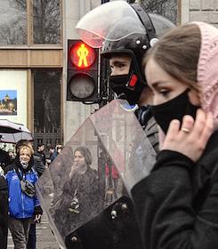 Несогласованная акция в поддержку политика Алексея Навального. Профиль участницы акции и сотрудника Росгвардии во время проведения акции.