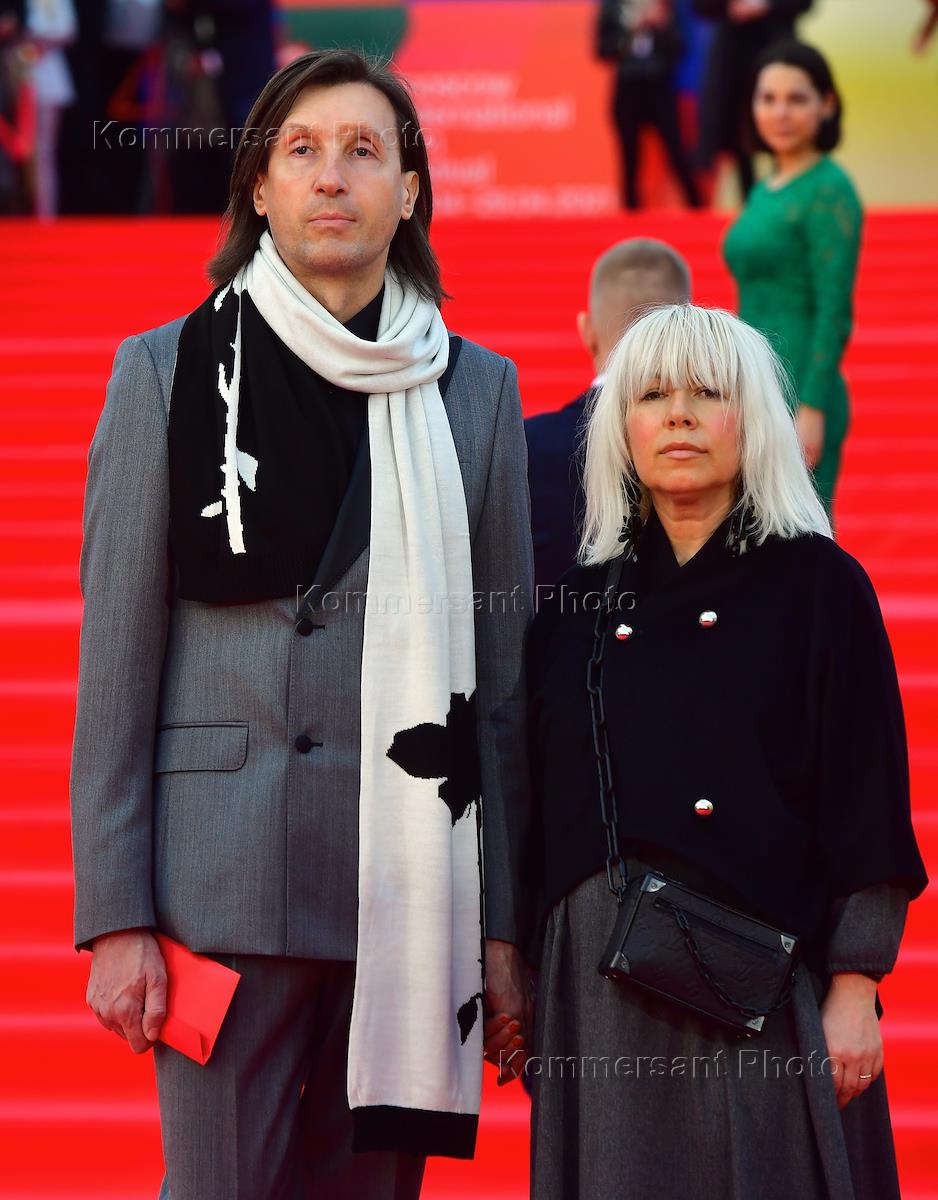 43-й Московский международный кинофестиваль (ММКФ). Церемония открытия ММКФ в Московском театре мюзикла. Дизайнер Сергей Сысоев (слева) с супругой Ольгой во время церемонии.