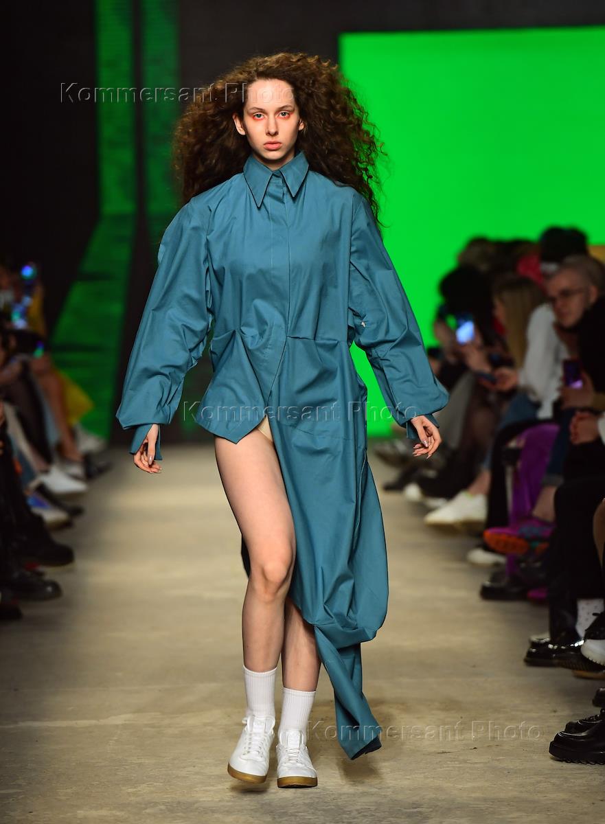 Неделя моды Mercedes-Benz Fashion Week Russia в Музее Москвы. Модель во время показа коллекции бренда HARD BY HSE ART AND DESIGN SCHOOL студентов направления "Мода" Школы дизайна НИУ ВШЭ.