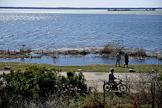 Жанровая фотография. Мужчина на велосипеде едет по краю асфальтированной дороги.