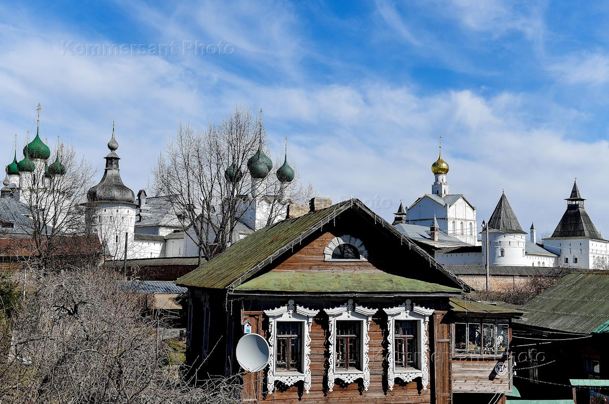 Виды Ростова Великого. Жанровая фотография. Старинный деревянный дом на фоне церквей.