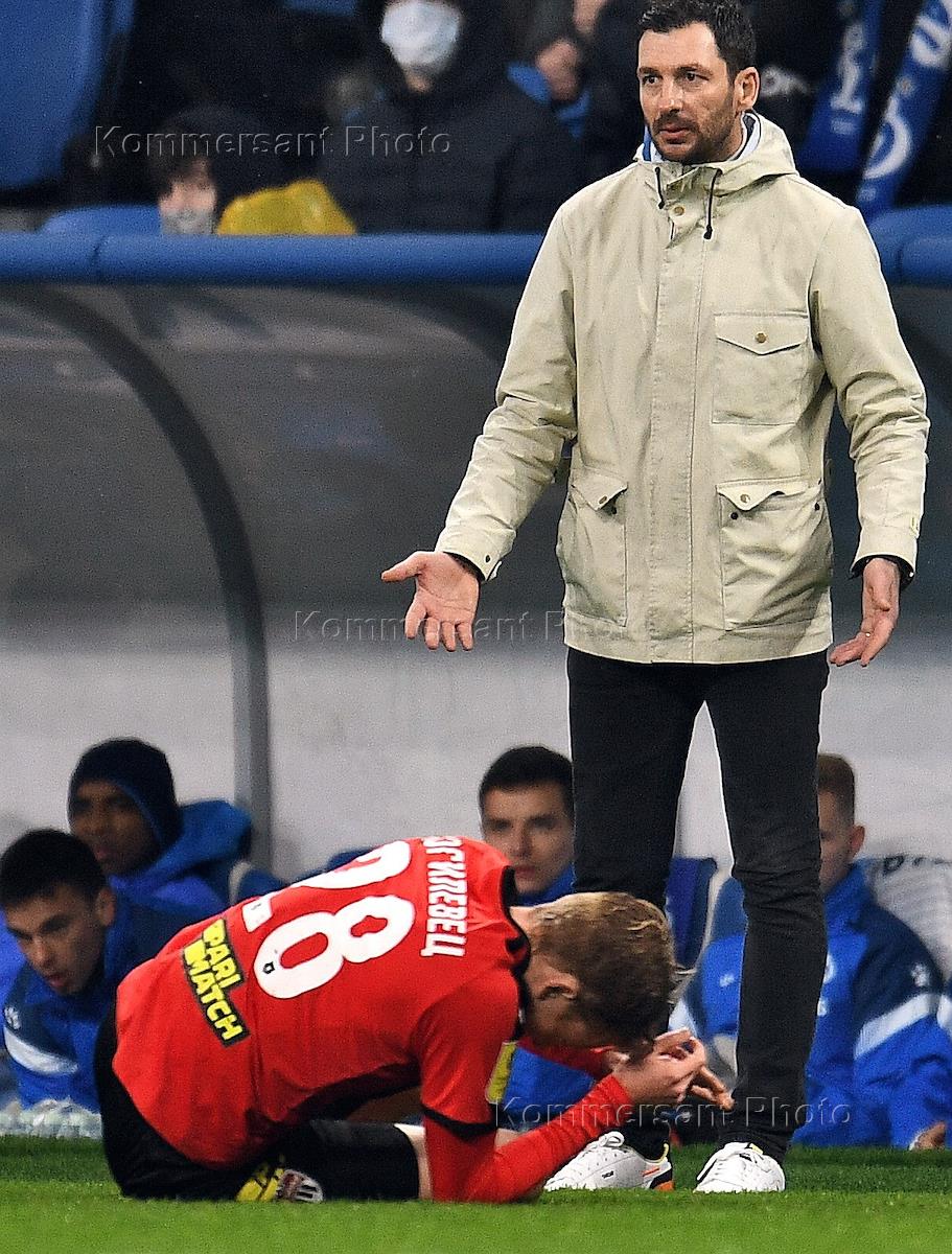Российская Премьер-Лига (РПЛ). Тинькофф - Чемпионат России по футболу 2020/2021. 27-й тур. Матч между командами "Динамо" (Москва) - "Химки" (Химки) на стадионе "ВТБ Арена". Главный тренер команды "Динамо" Сандро Шварц (справа) и игрок команды "Химки" Павел Могилевец(слева) во время матча.