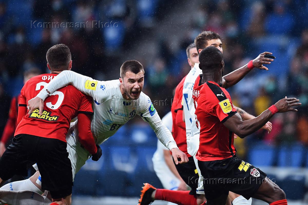 Российская Премьер-Лига (РПЛ). Тинькофф - Чемпионат России по футболу 2020/2021. 27-й тур. Матч между командами "Динамо" (Москва) - "Химки" (Химки) на стадионе "ВТБ Арена". Игрок команды "Химки" Дмитрий Тихий (справа) во время матча.