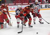 Континентальная хоккейная лига (КХЛ). Чемпионат сезона 2020/21. Финал. Матч между командами "Авангард" (Омск) - ЦСКА (Москва) на стадионе "Арена-Балашиха" имени Юрия Ляпкина. Слева направо: игроки команды ЦСКА Ларс Юханссон (вратарь, Богдан Киселевич и игрок команды "Авангард" Денис Зернов во время матча.