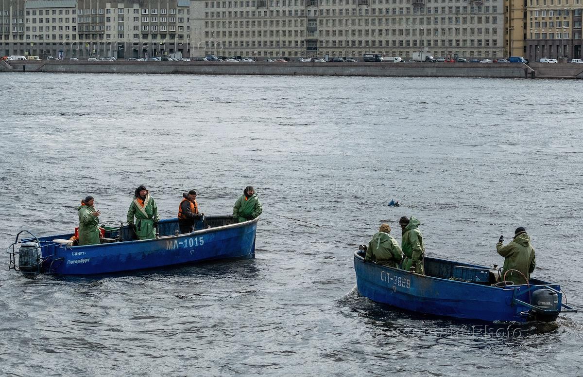Промысловый лов корюшки в Неве. Жанровая фотография. Рыбаки в лодках во время лова корюшки.