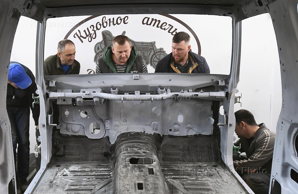 Автосервис Pan Motors. Жанровая фотография. Рабочие во время ремонта автомобиля.