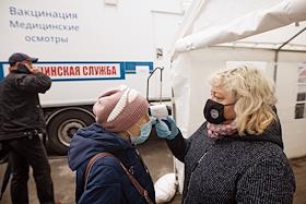 Вакцинация против коронавирусной инфекции COVID-19 в Мобильном центре ЦГКБ. Измерение температуры перед началом вакцинации.