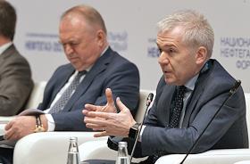 Национальный нефтегазовый форум 2021 в Центральном выставочном комплексе (ЦВК) "Экспоцентр". Председатель Совета Союза нефтегазопромышленников России Юрий Шафраник (второй справа) во время пленарной сессии "Технологическое развитие и трансформация ТЭК: новые точки роста, международное сотрудничество и трансфер инноваций".