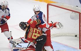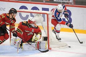 Континентальная хоккейная лига (КХЛ). Чемпионат сезона 2020/21. Финал. Матч между командами "Авангард" (Омск) - ЦСКА (Москва) на стадионе "Арена-Балашиха" имени Юрия Ляпкина. Игрок команды ЦСКА Клас Дальбек (слева) и вратарь команды ЦСКА Ларс Юханссон (справа) во время матча.