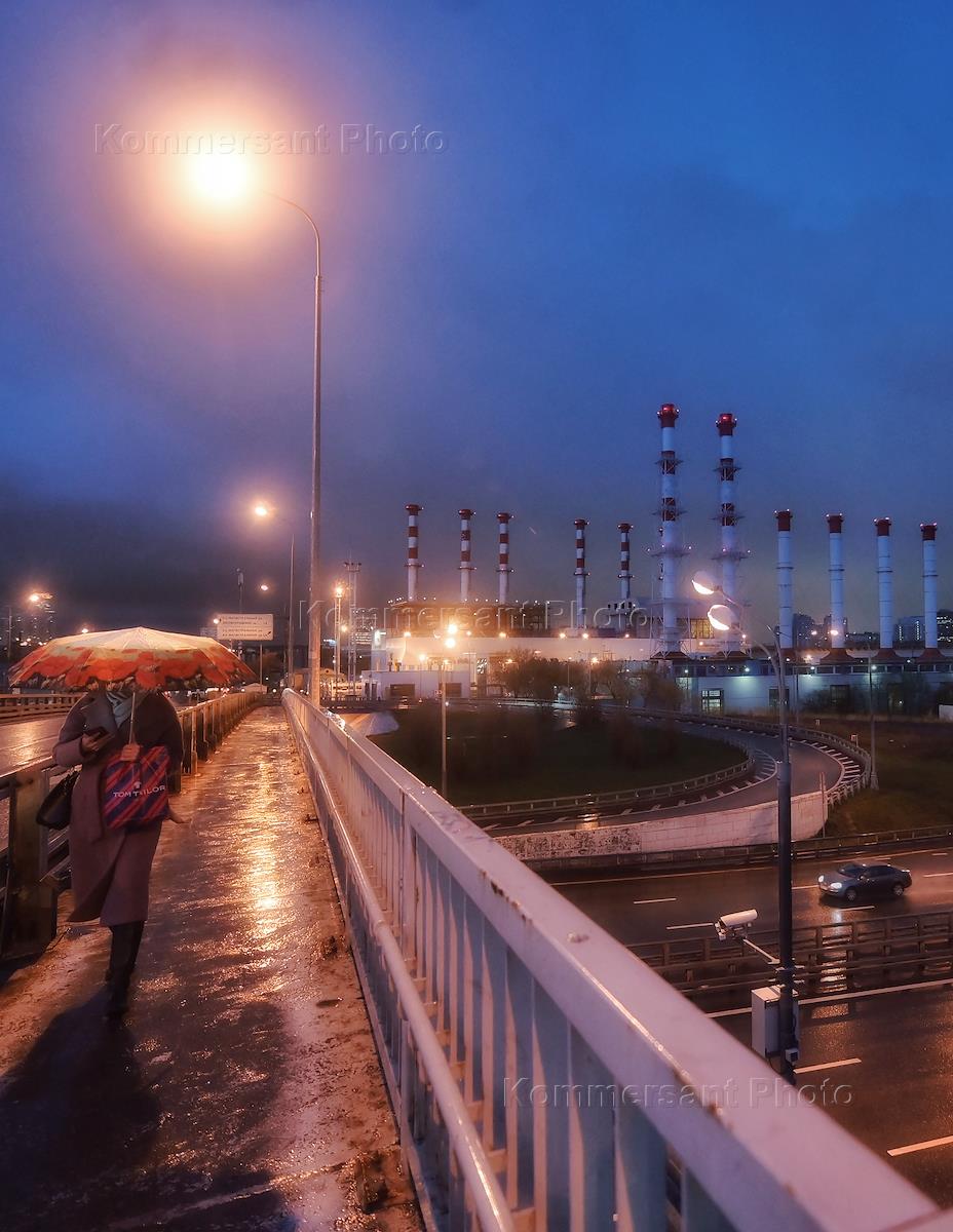 Виды Москвы. Жанровая фотография. Женщина под зонтом идет по мосту над проезжей частью.
