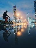 Виды Москвы. Жанровая фотография. Велосипедист на Пресненской набережной переежзает лужу на пешеходном переходе.