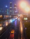 Виды Москвы. Жанровая фотография. Автомобиль движется по дороге во время дождя на фоне башен Московского международного делового центра "Москва-сити".