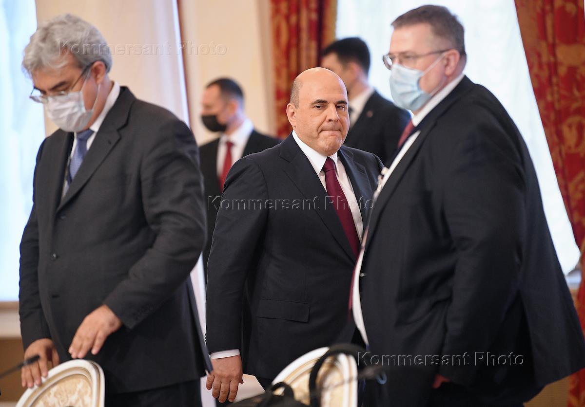 Рабочая поездка председателя правительства России Михаила Мишустина в Татарстан. Заседание Евразийского межправительственного совета в узком составе в Казани. Председатель Правительства России Михаил Мишустин (в центре) во время встречи с премьер-министром Узбекистана Абдуллой Ариповым перед началом заседания Евразийского межправительственного совета.