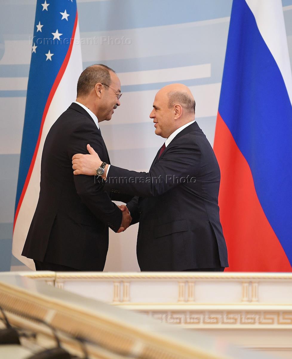 Рабочая поездка председателя правительства России Михаила Мишустина в Татарстан. Заседание Евразийского межправительственного совета в узком составе в Казани. Председатель Правительства России Михаил Мишустин (справа) и премьер-министр Узбекистана Абдулла Арипов (слева) во время встречи перед началом заседания Евразийского межправительственного совета.