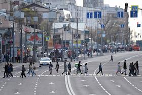 Ночная репетиция военного парада на Красной площади в честь 76-й годовщины Победы в Великой Отечественной войне. Жанровая фотография. Прохожие переходят улицу по пешеходному переходу.