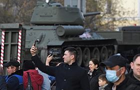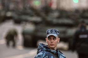 Ночная репетиция военного парада на Красной площади в честь 76-й годовщины Победы в Великой Отечественной войне. Проезд военной техники по улицам города.