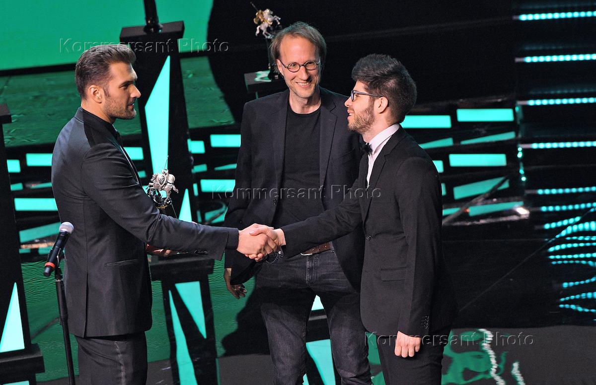 Closing ceremony of the 43rd Moscow International Film Festival (MIFF) at the Moscow Musical Theater. Actor Milos Bikovich (left) and director Andrei Khutsulyak (right) during the ceremony.