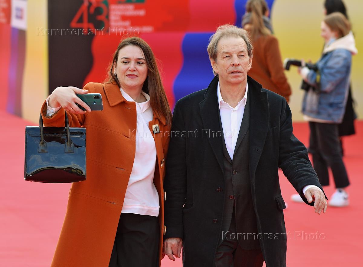Closing ceremony of the 43rd Moscow International Film Festival (MIFF) at the Moscow Musical Theater. Moscow City Duma deputy, actor Yevgeny Gerasimov (left) and Alena Aesthetic clinic owner Alena Kutaliya (center) on the red carpet before the ceremony.