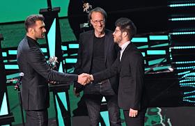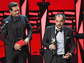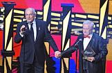 Closing ceremony of the 43rd Moscow International Film Festival (MIFF) at the Moscow Musical Theater. Actor Milos Bikovich (left) and director Andrei Khutsulyak (right) during the ceremony.