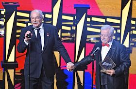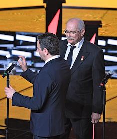 Closing ceremony of the 43rd Moscow International Film Festival (MIFF) at the Moscow Musical Theater. Chairman of the Union of Cinematographers of Russia, film director Nikita Mikhalkov (left) and actor Sergei Nikonenko (right) during the ceremony.