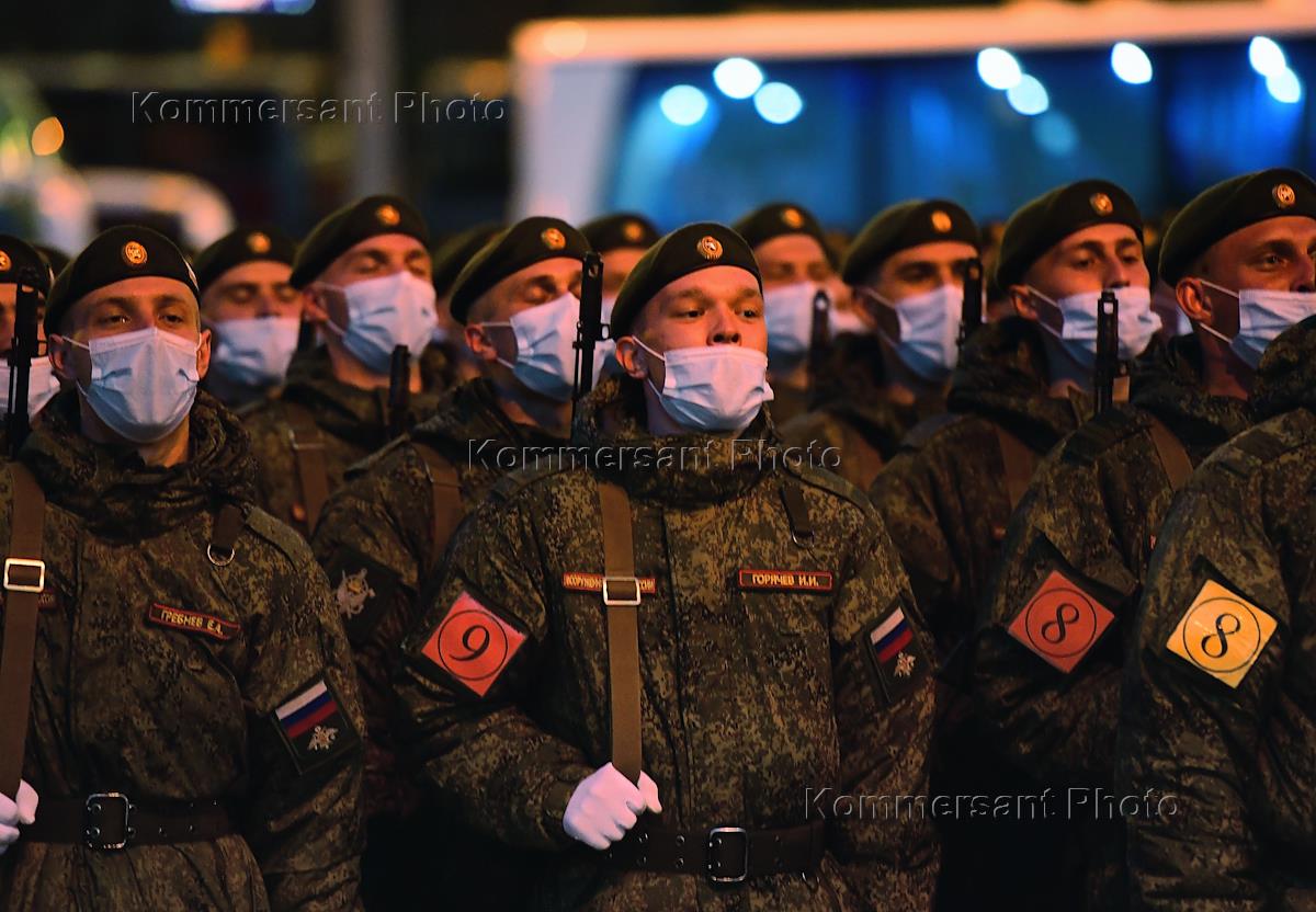 Ночная репетиция военного парада на Красной площади в честь 76-й годовщины Победы в Великой Отечественной войне. Военнослужащие во время репетиции.