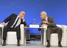 Итоговое заседание коллегии Министерства спорта России в Гостином дворе. Президент Федерации тенниса России Шамиль Тарпищев (справа) и министр спорта России Олег Матыцин (слева) перед началом заседания.