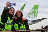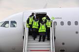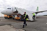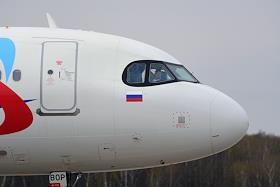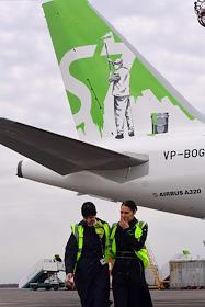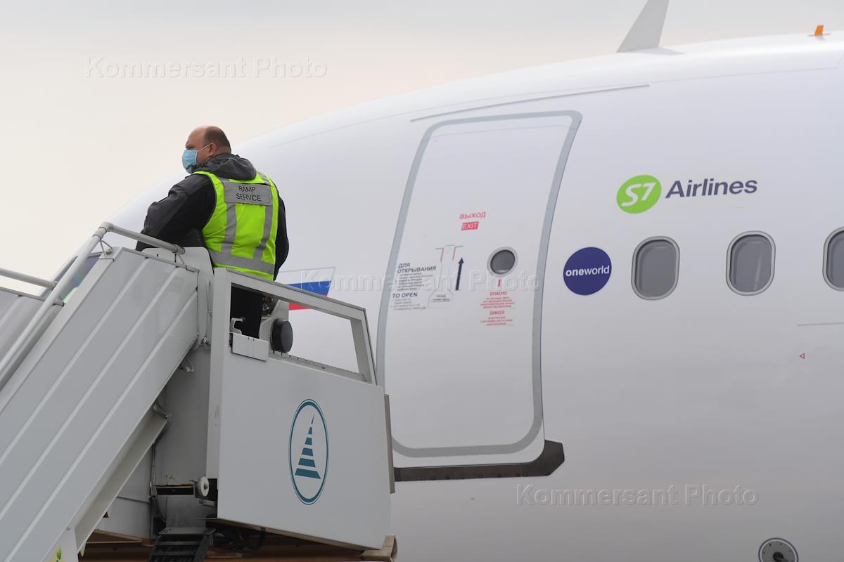 Прилет самолета Airbus A320 авиакомпании S7 Airlines в новой ливрее, созданной Музеем стрит-арта, в международный аэропорт "Домодедово" имени М.В. Ломоносова. Жанровая фотография. Экипаж на борту самолета.