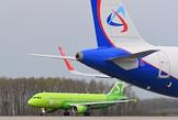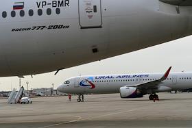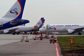 Жанровая фотография. Самолет компании Ural Airlines на летном поле международного аэропорта "Домодедово" имени М.В. Ломоносова.