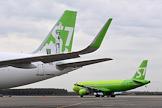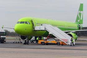 Жанровая фотография. Самолет компании S7 на летном поле международного аэропорта "Домодедово" имени М.В. Ломоносова.