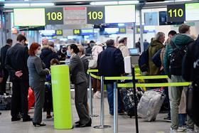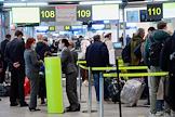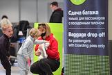 Жанровая фотография. Пассажиры у стоек регистрации в международном аэропорту "Домодедово" имени М.В. Ломоносова.