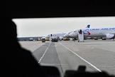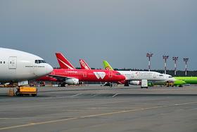 Жанровая фотография. Самолеты Boeing 777-200 ER, компаний Red wings и S7 на летном поле международного аэропорта "Домодедово" имени М.В. Ломоносова.