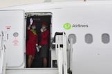 Прилет самолета Airbus A320 авиакомпании S7 Airlines в новой ливрее, созданной Музеем стрит-арта, в международныйо аэропорт "Домодедово" имени М.В. Ломоносова. Жанровая фотография. Бортпроводницы на борту самолета.