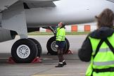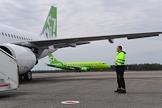 Прилет самолета Airbus A320 авиакомпании S7 Airlines в новой ливрее, созданной Музеем стрит-арта, в международныйо аэропорт "Домодедово" имени М.В. Ломоносова. Жанровая фотография. Сотрудник аэропорта во время подачи трапа.