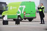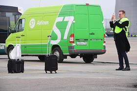 Жанровая фотография. Микроавтобус авиакомпании S7 Airlines на летном поле в международном аэропорту "Домодедово" имени М.В. Ломоносова.
